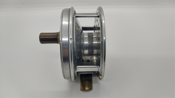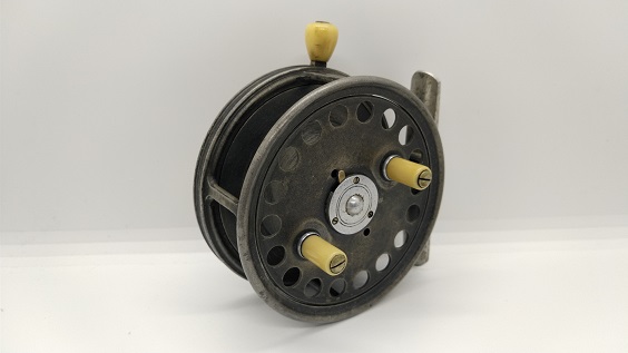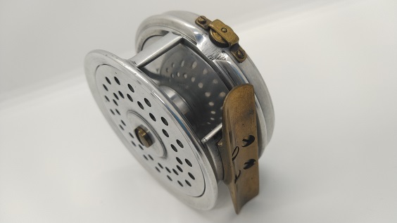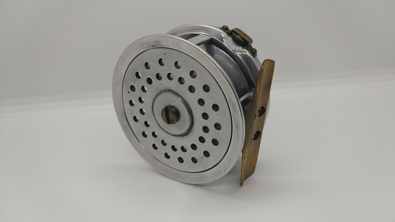 1939年製のリールです。ヤングのリールを彷彿させる名前と作りですが、ヤング社の刻印はありません。背面のon/offスイッチでクリックが解除されてフリースプールになり、となりのダイヤルでブレーキの制御をするシステムです。当時のイギリスはこういうリールでベイトキャスティングをしていたのが面白いですね。もちろんフライリールとしても機能します。リールの直径は約89mm。スプール内側の幅は約23mmです。経年や使用による小キズ・ヨゴレなどはありますが、年代から考えるととてもキレイな状態です。現状販売。 Made