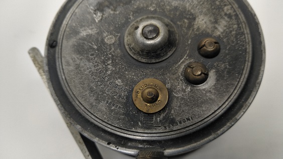 1906年製のサーモンフライリールです。名前の通りセンターのローレットスクリューでブレーキが成魚できるシステムを搭載しています。パテントナンバーが刻印されているので同社の特許だったのでしょう。サイズが大きいので、13フィート以上のバンブーフライロッドに適合しそうです。リールの直径は約113mm。スプール内側の幅は約30mmです。経年や使用による小キズ・ヨゴレなどはありますが、年代から考えるととてもキレイな状態です。現状販売。 Made