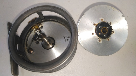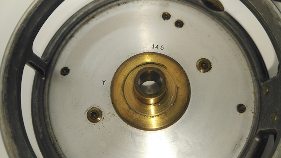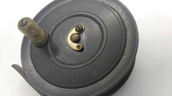 1911年製のイギリス製フライリールです。刻印などはありませんがPersy WadhamのTestというフライリールです。ダイヤルを回してクリックのON/OFF操作をする独特な機構です。DT3前後のラインにぴったりなサイズです。リールの直径は約72mm。スプール内側の幅は約16.5mmです。経年や使用によりリムの一部が欠損しています。またキズ・ヨゴレなどはあります。フットにも多少変形がありますが、古いハーディーなどのバンブーロッドの「ユニバーサルフィッティングリールシート」には装着できると思います。現状販売。 Made