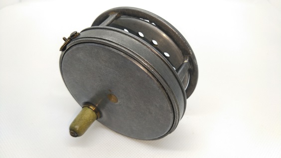 1906年製のサーモンフライリールです。名前の通りセンターのローレットスクリューでブレーキが成魚できるシステムを搭載しています。パテントナンバーが刻印されているので同社の特許だったのでしょう。サイズが大きいので、13フィート以上のバンブーフライロッドに適合しそうです。リールの直径は約113mm。スプール内側の幅は約30mmです。経年や使用による小キズ・ヨゴレなどはありますが、年代から考えるととてもキレイな状態です。現状販売。 Made